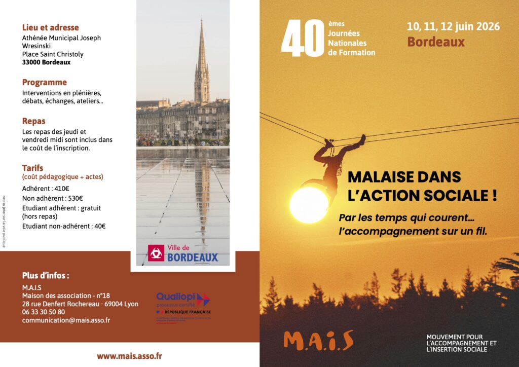 Les 40èmes journées nationales de formation du Mouvement pour l’Accompagnement et l’Insertion Sociale (MAIS) se dérouleront à Bordeaux les 10, 11 et 12 juin 2026.