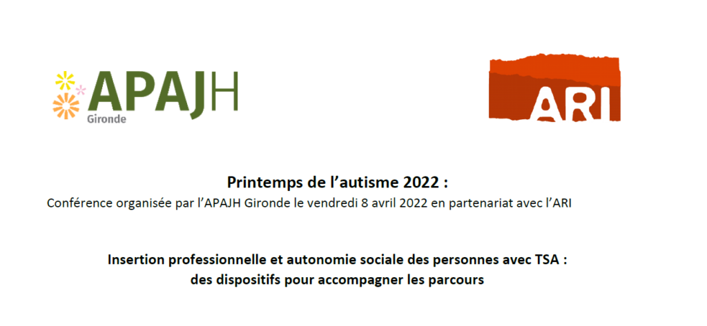 - 10h30-11h30 : L’accès au logement : quelles formes d’habitat ? Données actuelles et formats de réponses : l’exemple du projet d’habitat inclusif regroupé, par Mme Bénédicte Mendiboure Directrice Autisme & Projets inclusifs ARI. L’expérimentation au logement au SESSAD Pro, par Mme Damart, Mission habitat inclusif APAJH 33. L’Appart, habitat ressource, de quoi s’agit-il ? par un jeune adulte TSA avec le soutien de M. Gimel-Servan, Animateur du projet habitat inclusif ARI. Le maintien en logement par le SAMSAH Intervalle Asperger ARI, Témoignages.